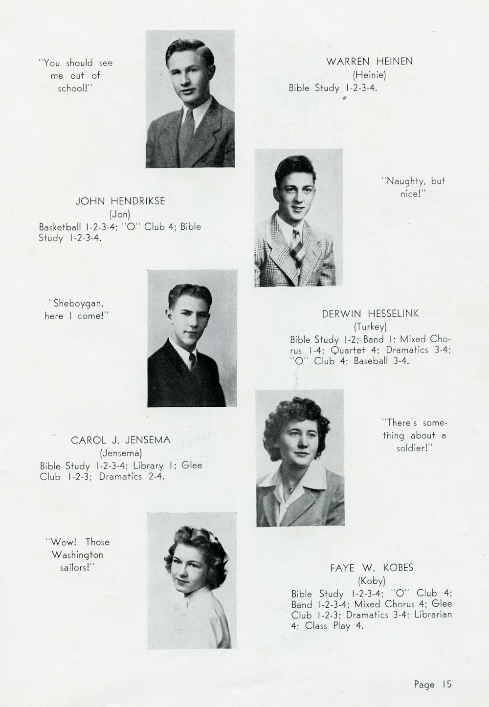 1946 Oostburg High School Page 15: Warren Heinen, John Hendrikse, Derwin Hesselink, Carol J. Jensema, Faye W. Kobes.