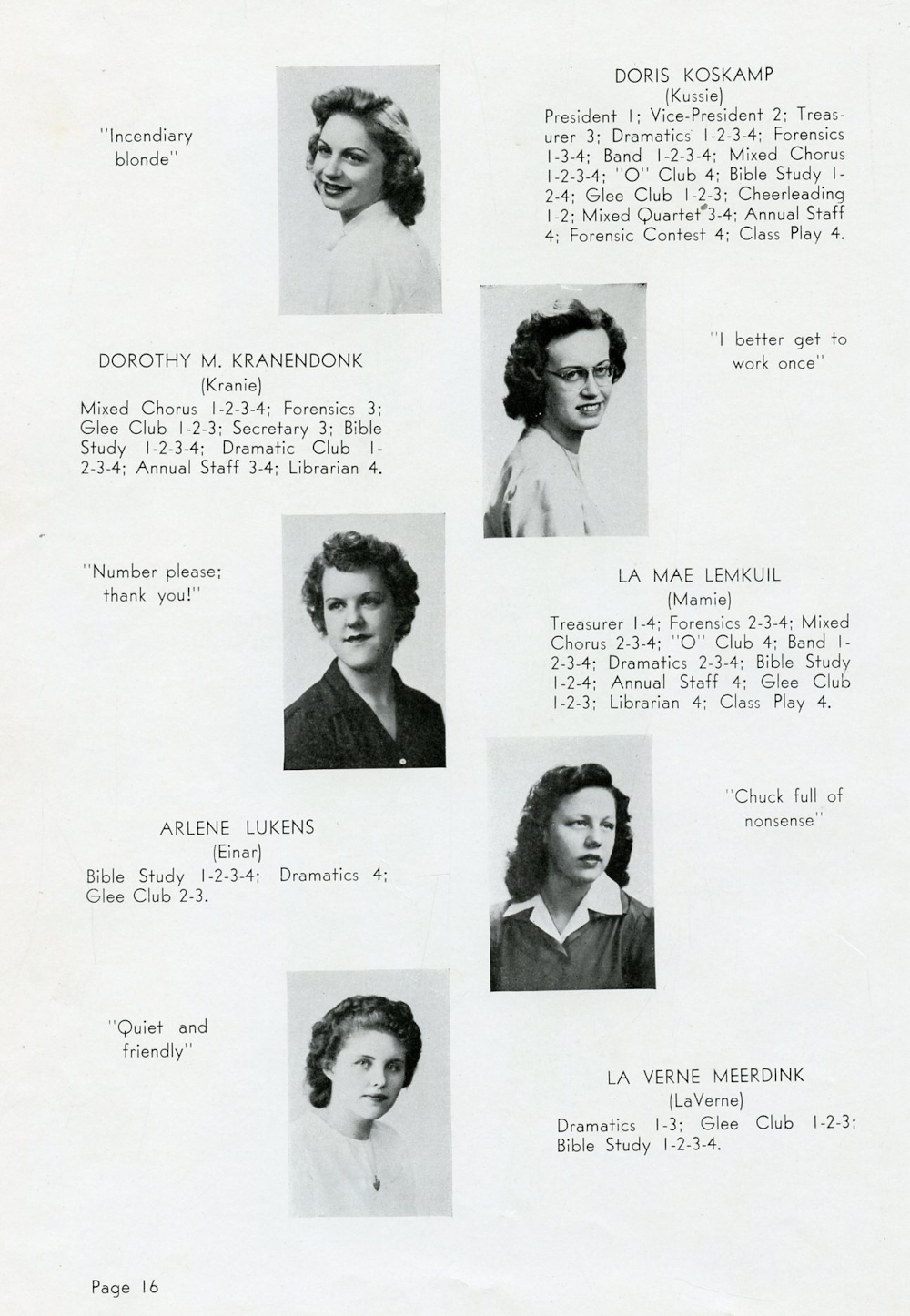 1946 Oostburg High School Page 16: Doris Koskamp, Dorothy M. Kranendonk, La Mae Lemkuil, Arlene Lukens, La Verne Meerdink.