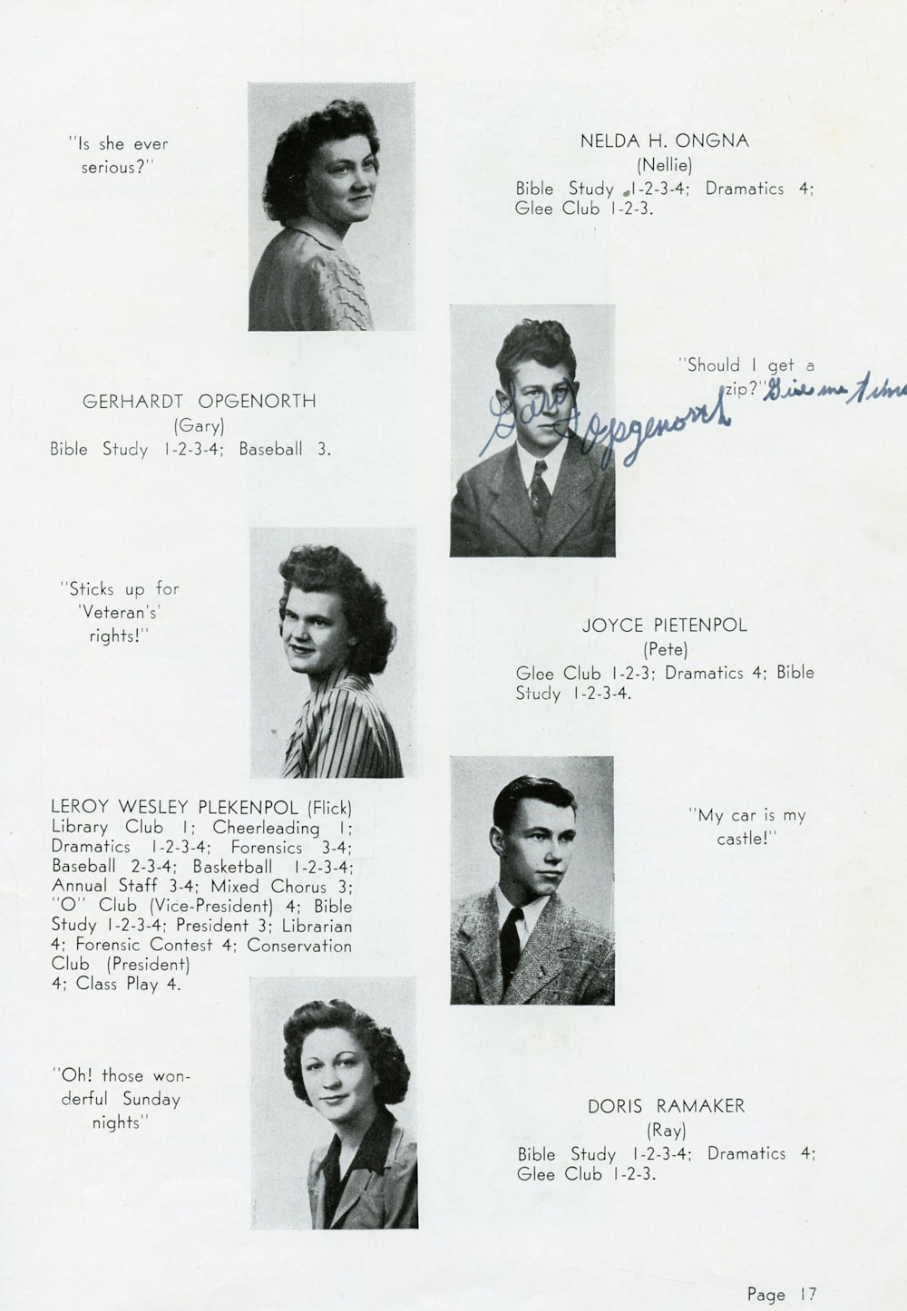 1946 Oostburg High School Page 17: Nelda H. Ongna, Gerhardt Opgenorth, Joyce Pietenpol, Leroy Wesley Plekenpol, Doris Ramaker.