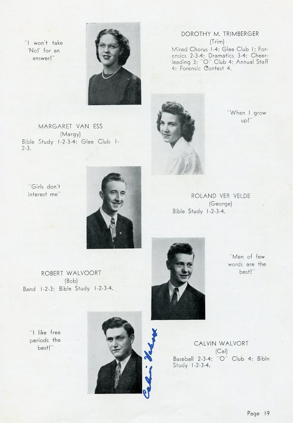 1946 Oostburg High School Page 19: Dorothy M. Trimberger, Margaret Van Ess, Roland Ver Velde, Robert Walvoort, Calvin Walvort.
