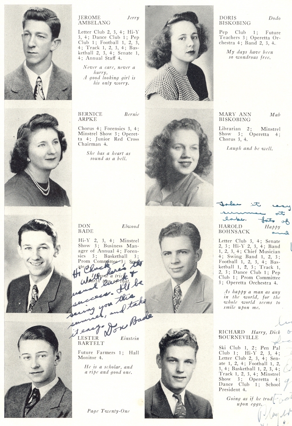 1946 Plymouth High School, Page 21: Jerome Ambeling, Bernice Arpke, Don Bade, Lester Bartelt, Doris Biskobing, Mary Biskobing, Harold Bohnsack, Rickard Bourneville.