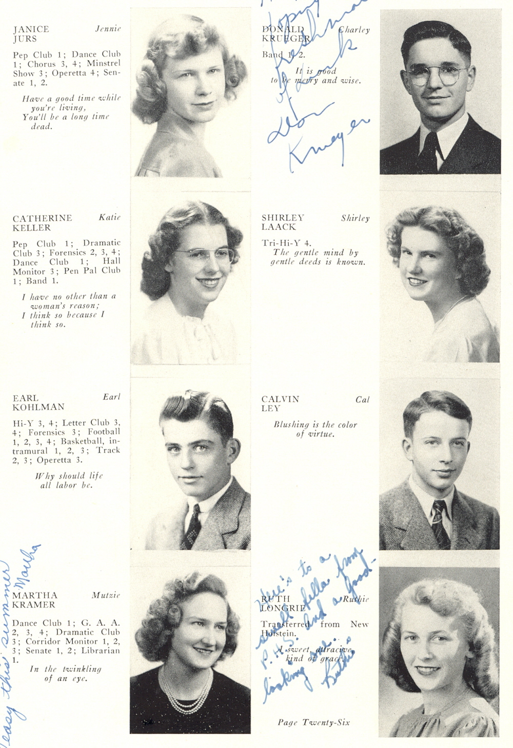 1946 Plymouth High School, Page 26: Janice Jurs, Catherine Keller, Earl Kohlman, Martha Kramer, Donald Krueger, Shirley Laack, Calvin Ley, Ruth Longrie.