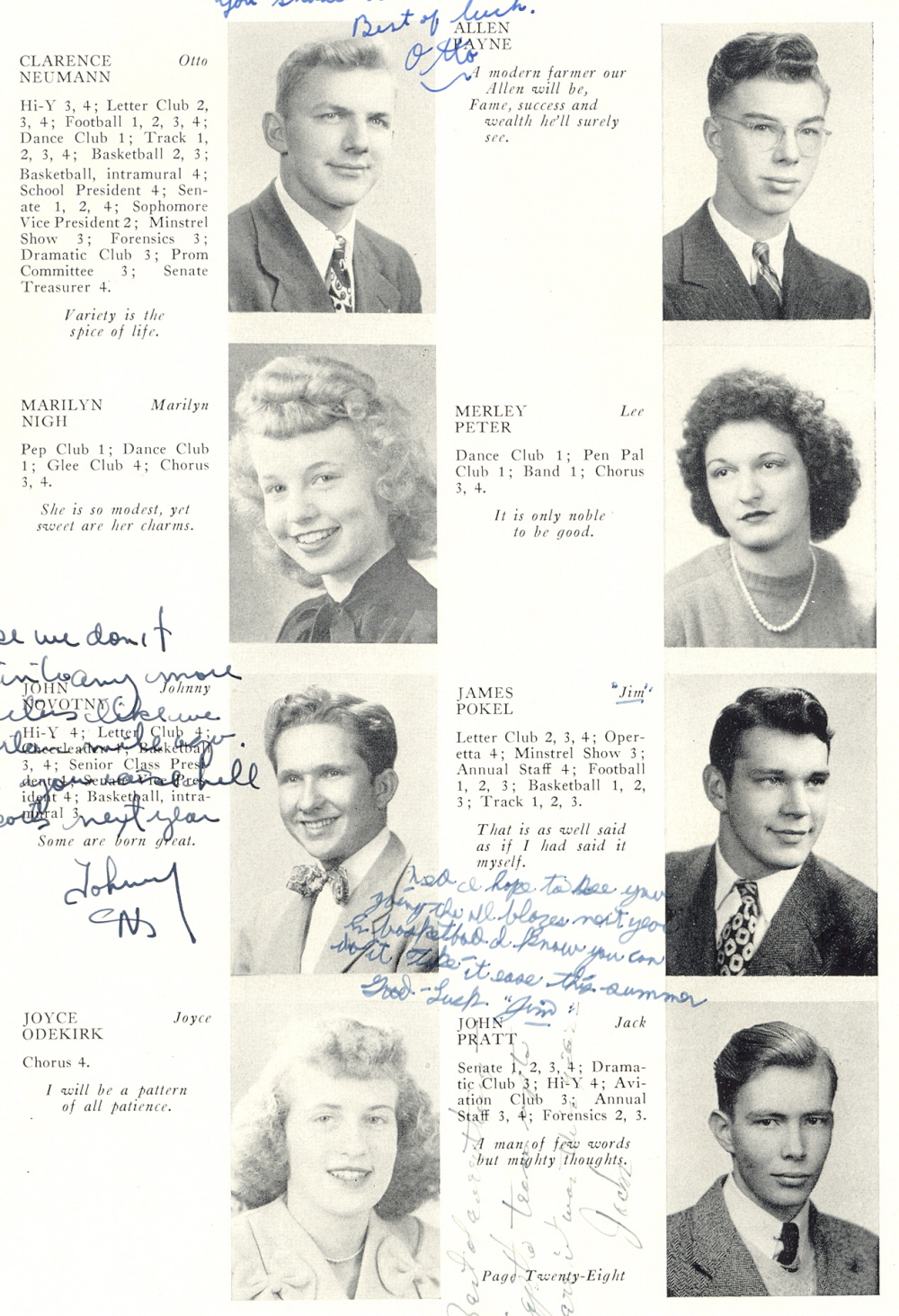 1946 Plymouth High School, Page 28: Clarence Neumann, Marilyn Nigh, John Novotky, Joyce Odekirk, Allen Payne, Merley Peter, James Pokel, John Pratt.
