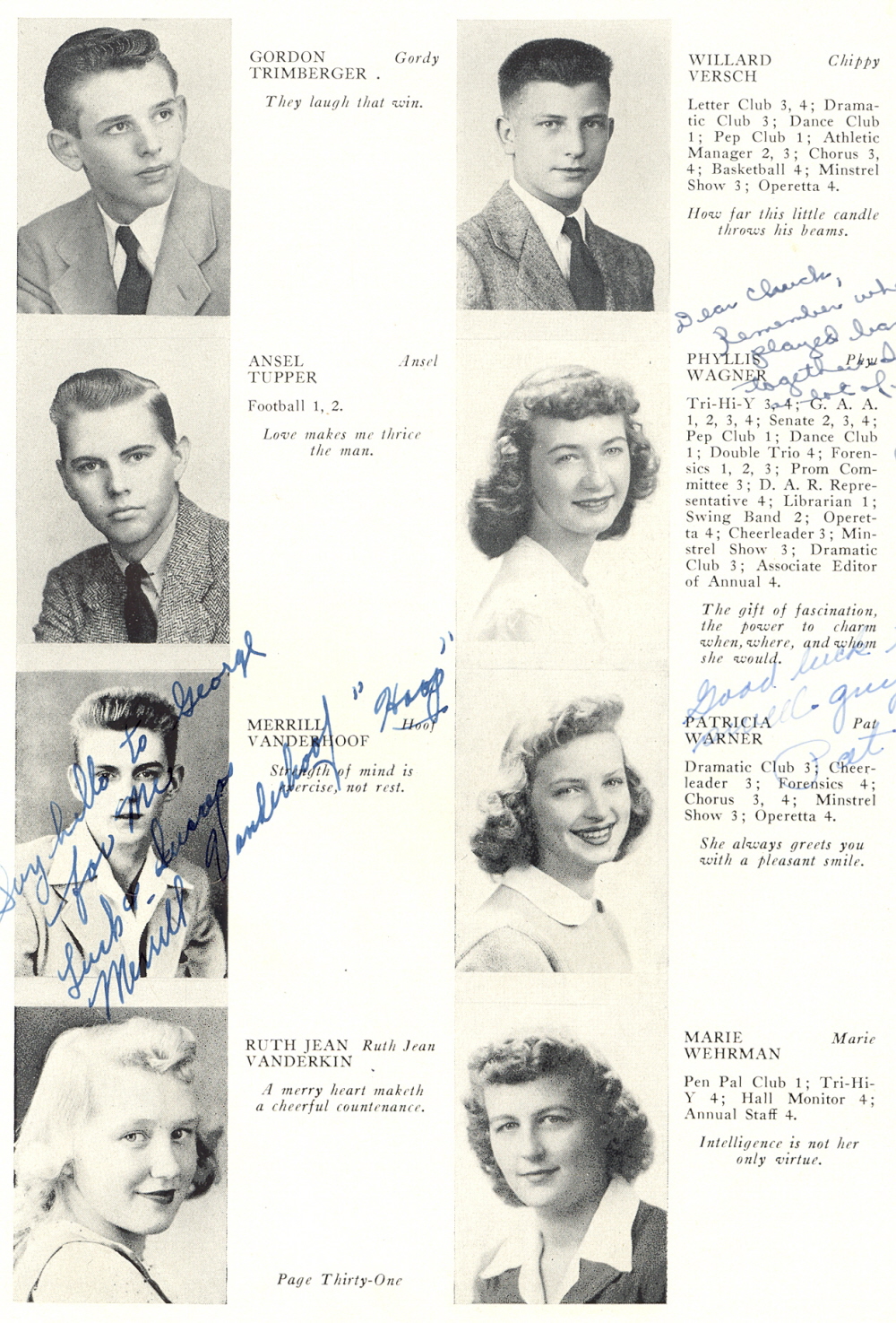 1946 Plymouth High School, Page 31: Gordon Trimberger, Ansel Tupper, Merrill Vanderhoof, Ruth Vanderkin, Willard Versch, Phyllis Wagner, Patricia Warner, Marie Wehrman.