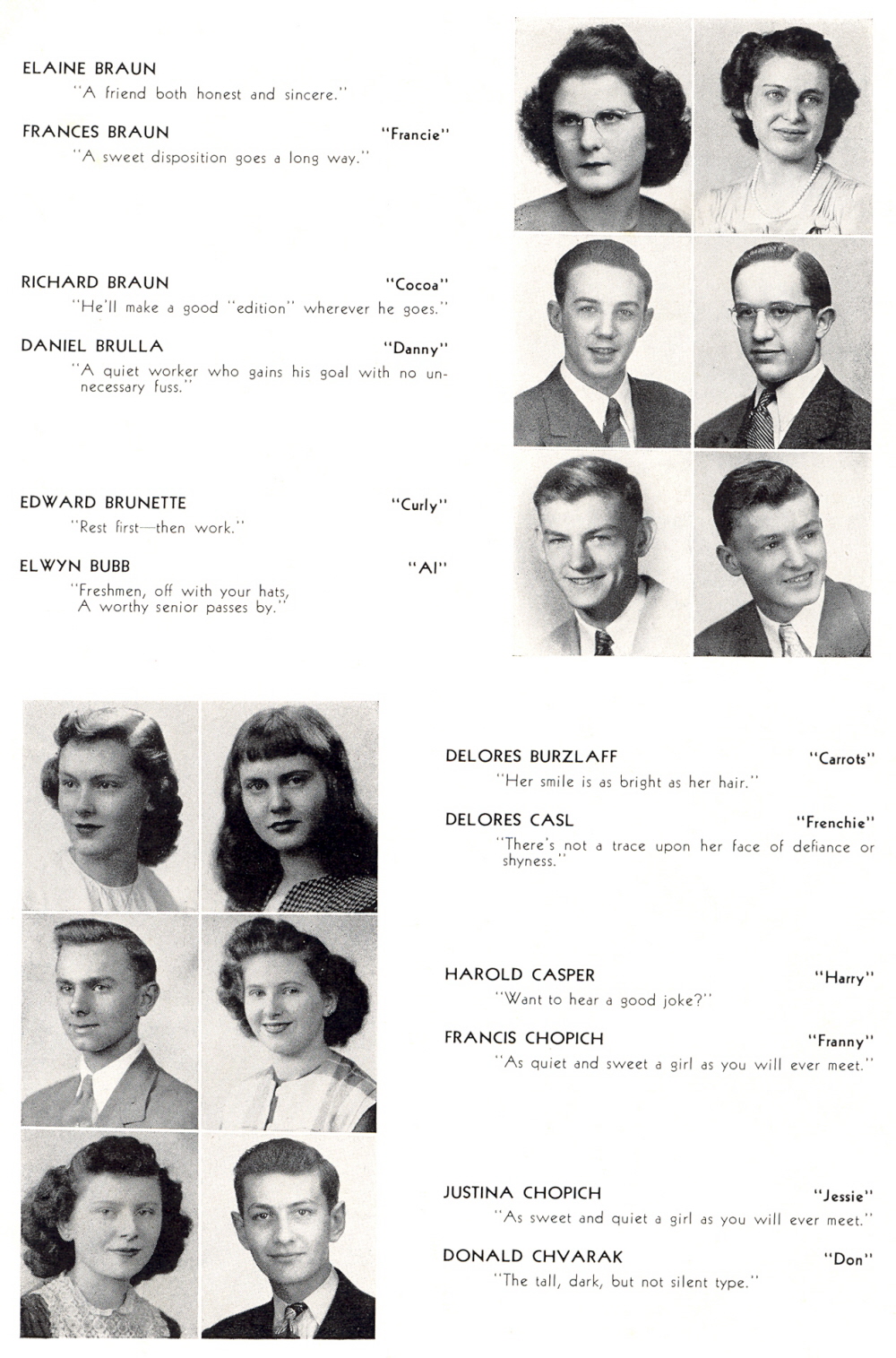 1946 Sheboygan Central High School, Page 28: Elaine Braun, Frances Braun, Richard Braun, Daniel Brulla, Edward Brunette, Elwyn Bubb, Delores Burzlaff, Delores Casl, Harold Casper, Francis Chopich, Justina Chopich, Donald Chvarak.