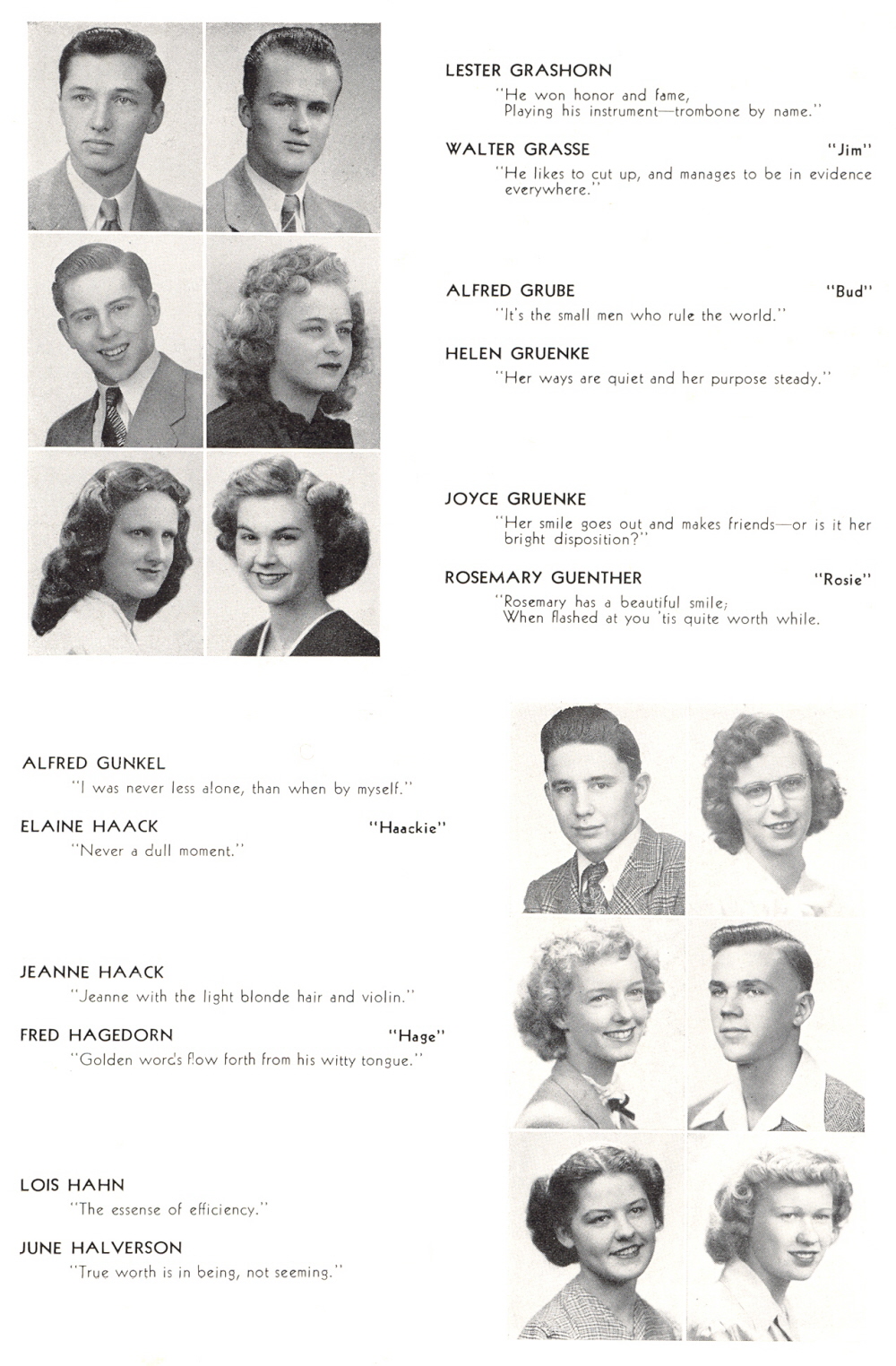 1946 Sheboygan Central High School, Page 34: Lester Grashorn, Walter Grasse, Alfred Grube, Helen Gruenke, Joyce Gruenke, Rosemary Guenther, Alfred Gunkel, Elaine Haack, Jeanne Haack, Fred Hagedorn, Lois Hahn, June Halverson.