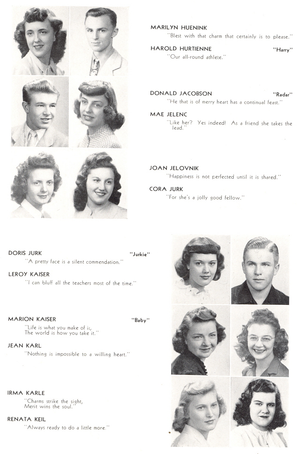 1946 Sheboygan Central High School, Page 37: Marilyn Huenink, Harold Hurtienne, Donald Jacobson, Mae Jelenc, Joan Jelovnik, Cora Jurk, Doris Jurk, Leroy Kaiser, Marion Kaiser, Jean Karl, Irma Karle, Renata Keil.