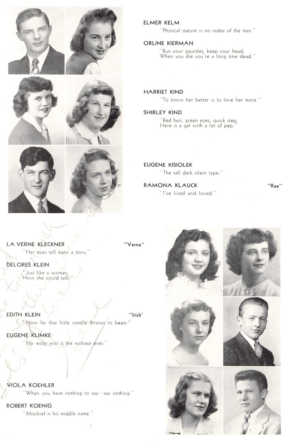 1946 Sheboygan Central High School, Page 38: Elmer Kelm, Orline Kierman, Harriet Kind, Shirley Kind, Eugene Kisiolek, Ramona Klauck, La Verne Kleckner, Delores Klein, Edith Klein, Eugene Klimke, Viola Koehler, Robert Koenig.