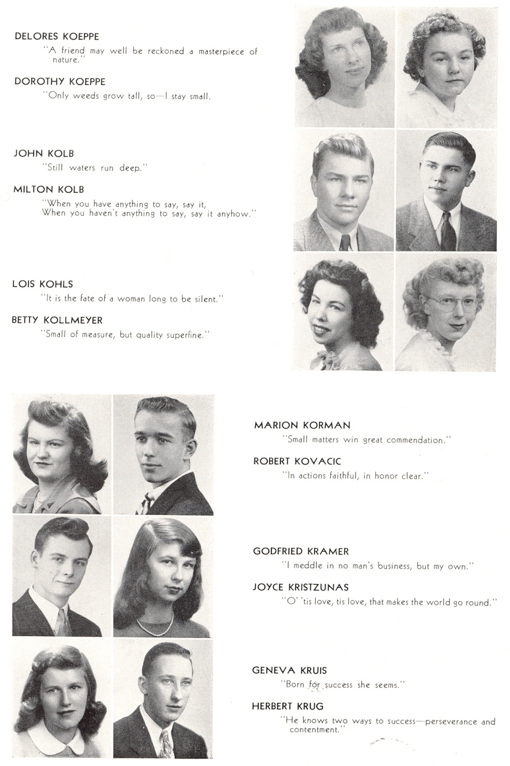 1946 Sheboygan Central High School, Page 39: Delores Koeppe, Dorothy Koeppe, John Kolb, Milton Kolb, Lois Kohls, Betty Kollmeyer, Marion Korman, Robert Kovacic, Godfried Kramer, Joyce Kristzunas, Geneva Kruis, Herbert Krug.