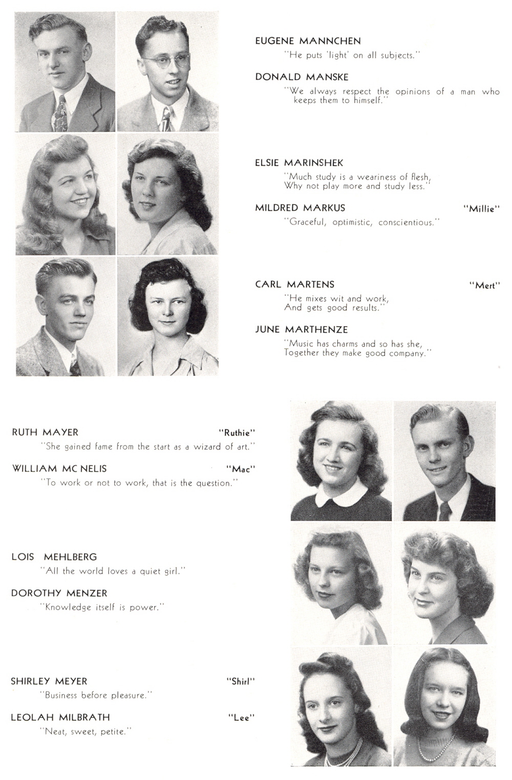 1946 Sheboygan Central High School, Page 41: Eugene Mannchen, Donald Manske, Elsie Marinshek, Mildred Markus, Carl Martens, June Marthenze, Ruth Mayer, William Mc Nelis, Lois Mehlberg, Dorothy Menzer, Shirley Meyer, Leolah Milbrath.