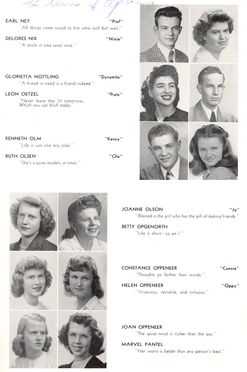 1946 Sheboygan Central High School, Page 43: Earl Ney, Delores Nix, Glorietta Nottling, Leon Oetzel, Kenneth Olm, Ruth Olsen, Joanne Olson, Betty Opgenorth, Constance Oppeneer, Helen Oppeneer, Joan Oppeneer, Marvel Pantel.