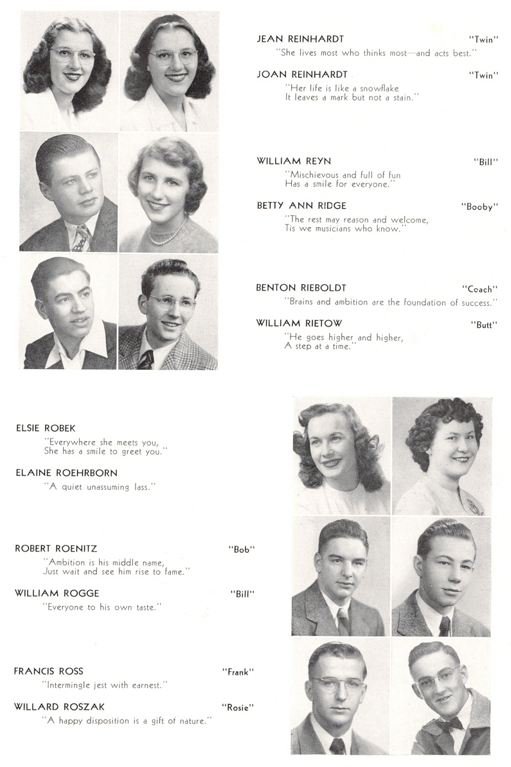 1946 Sheboygan Central High School, Page 45: Jean Reinhardt, Joan Reinhardt, William Reyn, Betty Ridge, Benton Rieboldt, William Rietow, Elsie Robek, Elaine Roehrborn, Robert Roenitz, William Rogge, Francis Ross, Willard Roszak.