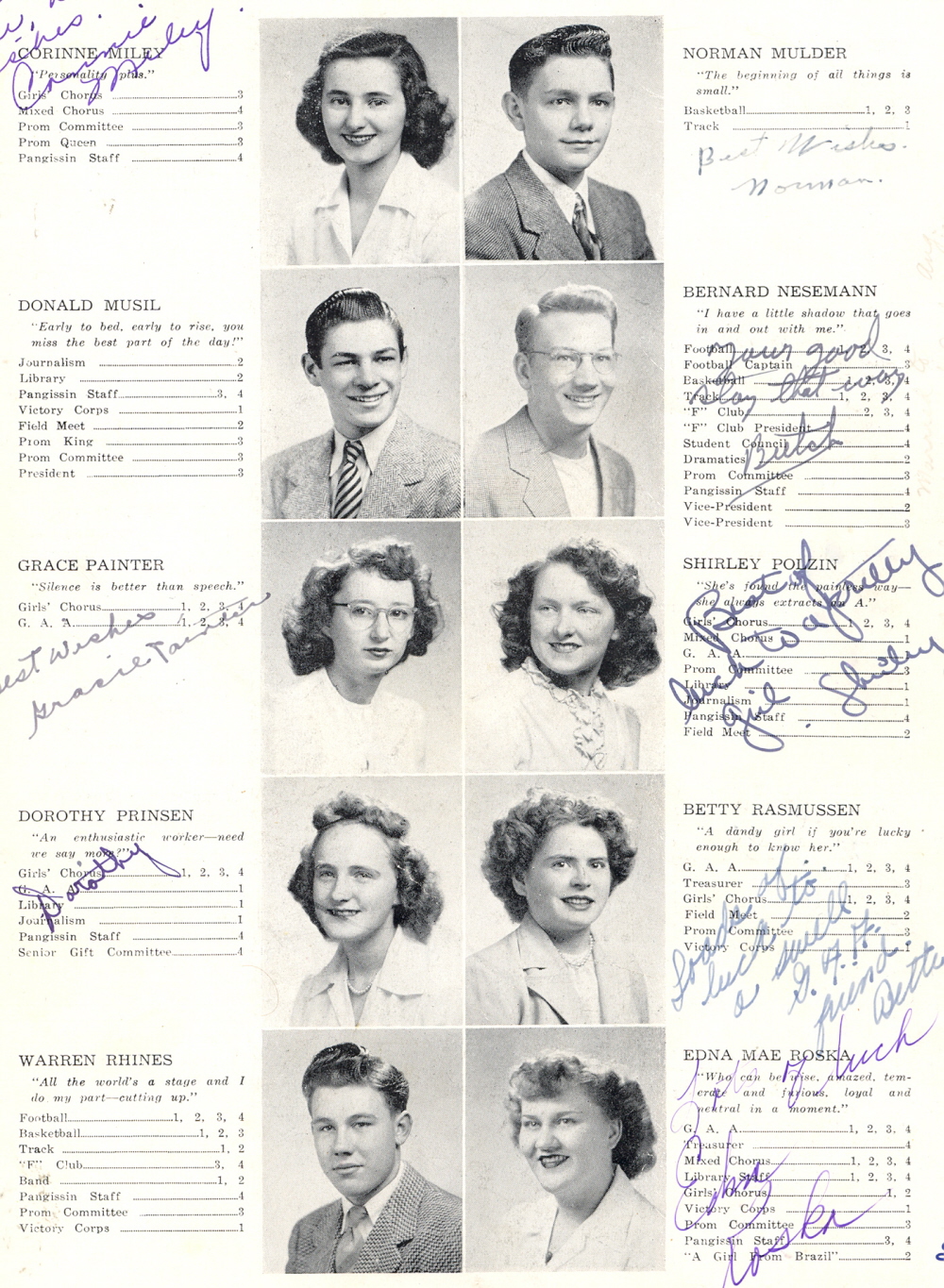 1946 Sheboygan Falls High School, Page 19: Corinne Miley, Norman Mulder, Donald Musil, Bernard Nesemann, Grace Painter, Shirley Polzin, Dorothy Prinsen, Betty Rasmussen, Warren Rhines, Edna Mae Roska.