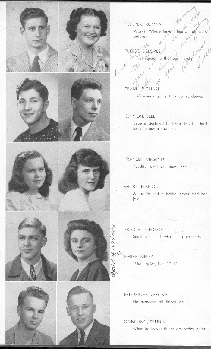 1946 Sheboygan North High School, Page 22: Roman Federer, Delores Fuerst, Richard Frank, Sebe Garton, Virginia Franzen, Marion Gerke, George Friedley, Melba Gerke, Jerome Friedrichs, Dennis Gonering.