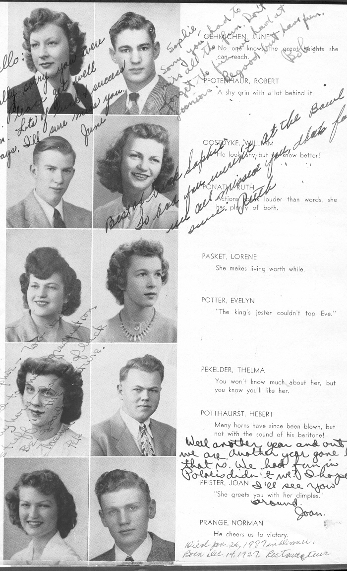 1946 Sheboygan North High School, Page 32: June Oehmichen, Robert Pfotenhaur, William Oostdyke, Ruth Ponath, Lorene Pasket, Evelyn Potter, Thelma Pekelder, Herbert Potthaurst, Joan Pfister, Norman Prange.
