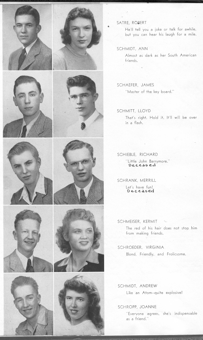 1946 Sheboygan North High School, Page 34: Robert Satre, Ann Schmidt, James Schaefer, Lloyd Schmitt, Richard Schieble, Merrill Schrank, Kermit Schmeiser, Virginia Schroeder, Andrew Schmidt, Joanne Schropp.