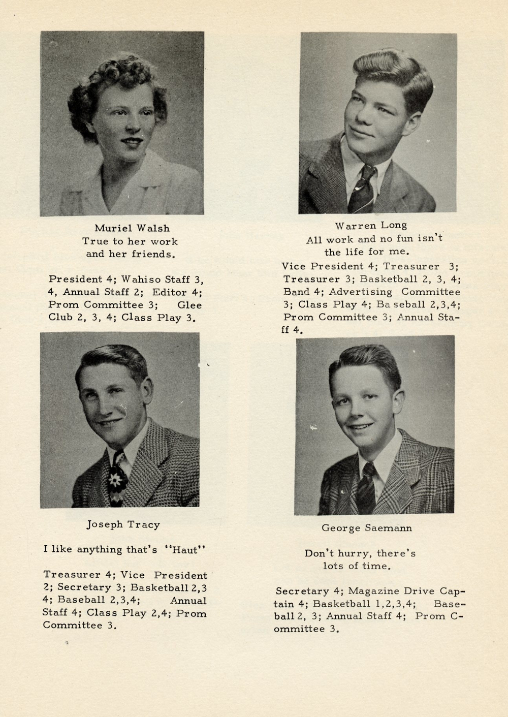 1946 Waldo High School Yearbook Page 8: Muriel Walsh, Warren Long, Joseph Tracy, George Saemann.