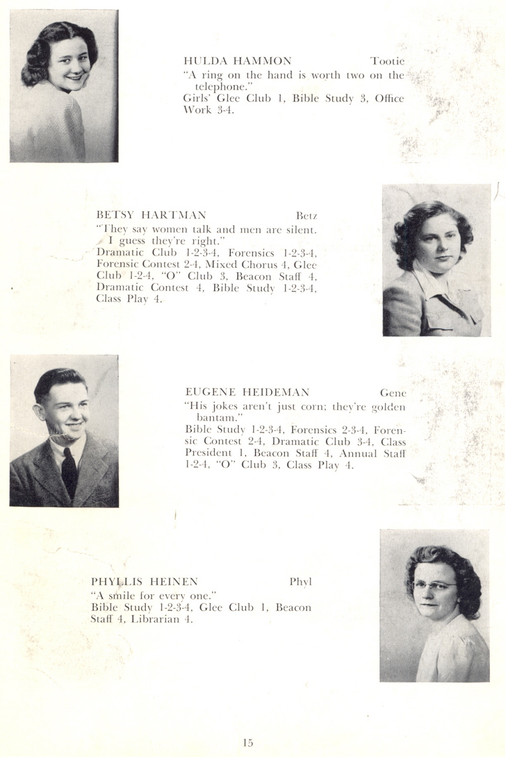 1947 Oostburg High School, Page 15: Hulda Hammon, Betsy Hartman, Eugene Heideman, Phyllis Heinen.