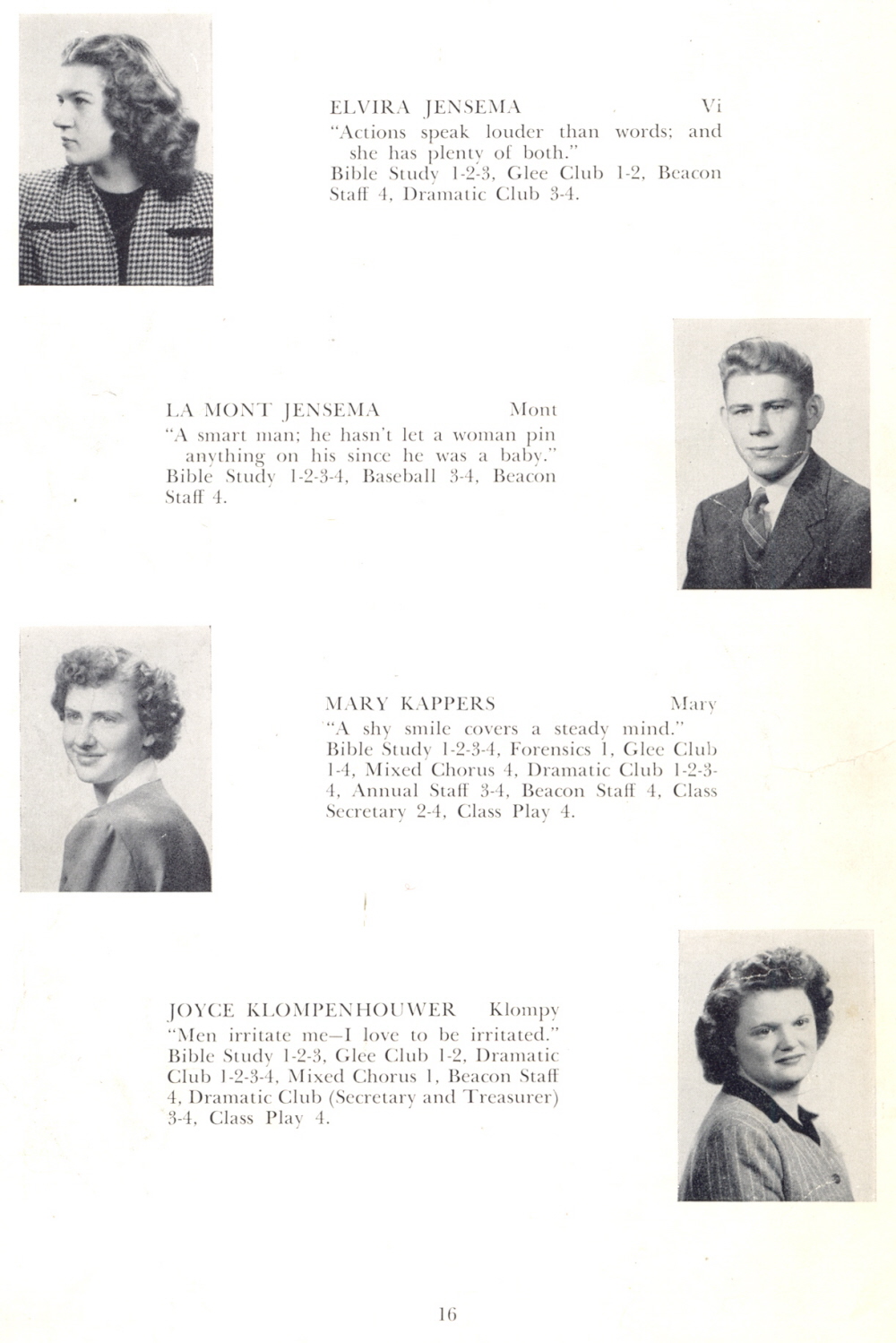 1947 Oostburg High School, Page 16: Elvira Jensema, La Mont Jensema, Mary Kappers, Joyce Klompenhouwer.