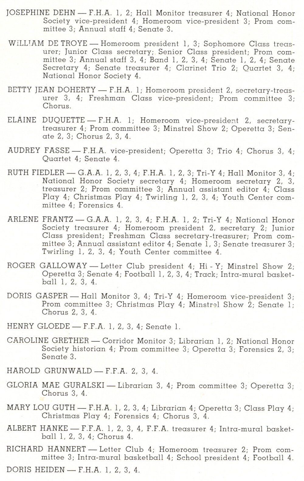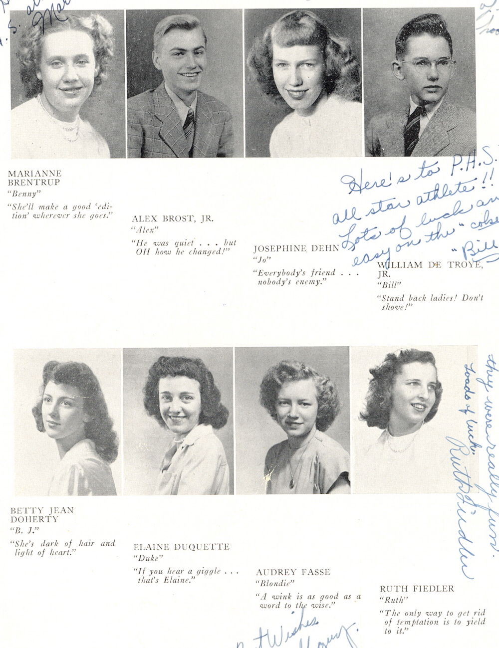 1947 Plymouth High School, Pages 21, 31 and 32: Marianne Bentrup, Alex Brost, Josephine Dehn, William De Troye, Betty Doherty, Elaine Duquette, Audrey Fasse, Ruth Fiedler.