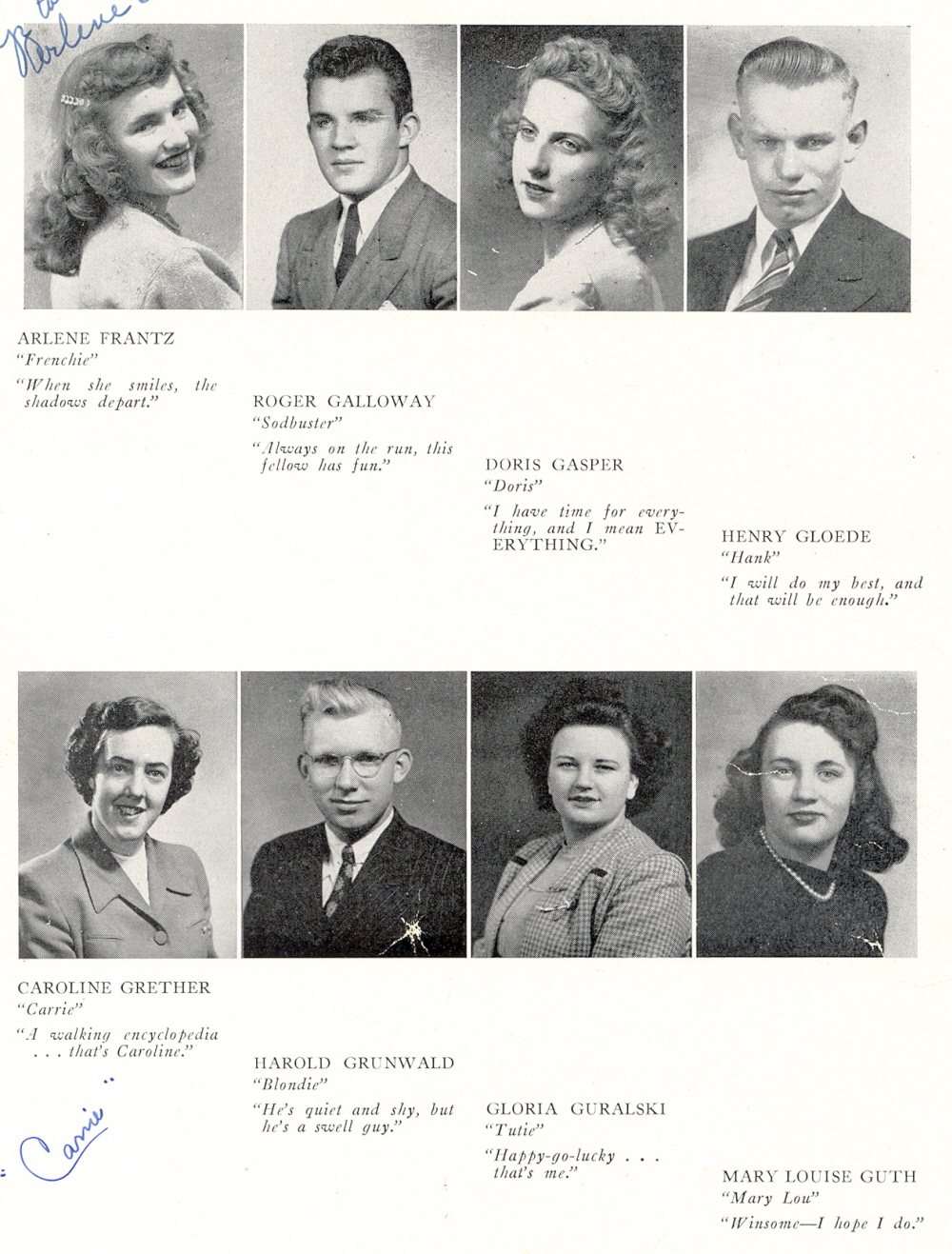 1947 Plymouth High School, Pages 22 and 32: Arlene Frantz, Roger Galloway, Doris Gasper, Henry Gloede, Caroline Grether, Harold Grunwald, Gloria Guralski, Mary Guth.