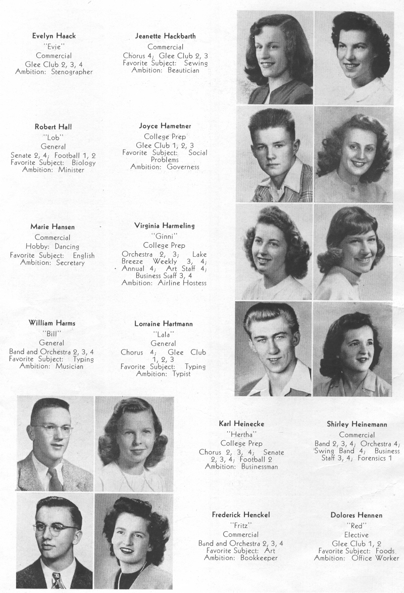1947 Sheboygan Central High School, Pages 32: Evelyn Haack, Jeanette Hackbarth, Robert Hall, Joyce Hametner, Marie Hansen, Virginia Harmeling, William Harms, Lorraine Hartmann, Karl Heinecke, Shirley Heinemann, Frederick Henckel, Dolores Hennen.
