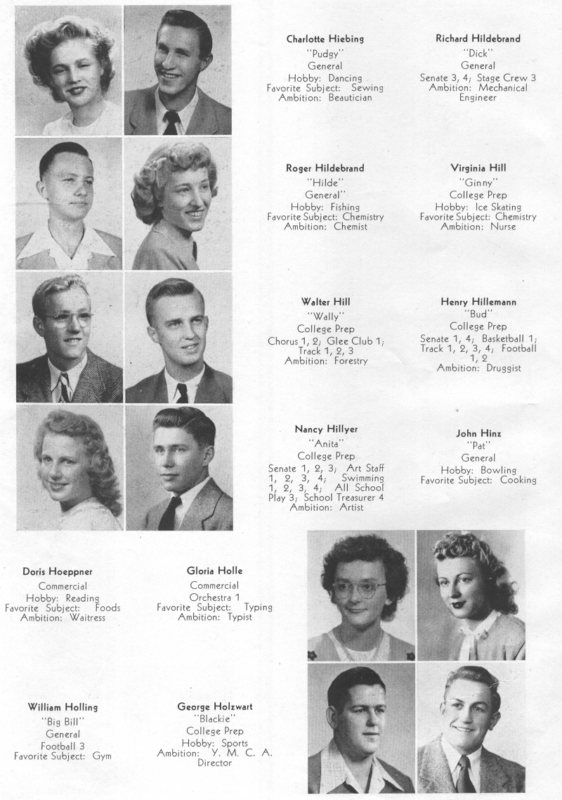 1947 Sheboygan Central High School, Pages 34: Charlotte Hiebing, Richard Hildebrand, Roger Hildebrand, Virginia Hill, Walter Hill, Henry Hillemann, Nancy Hillyer, John Hinz, Doris Hoeppner, Gloria Holle, William Holling, George Holzwart.