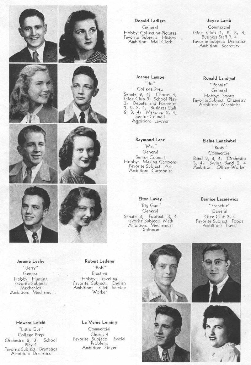 1947 Sheboygan Central High School, Pages 38: Donald Ladiges, Joyce Lamb, Joanne Lampe, Ronald Landgraf, Raymond Lane, Elaine Langkabel, Elton Lavey, Bernice Lazarewicz, Jerome Leahy, Robert Lederer, Howard Leicht, La Verne Leining.