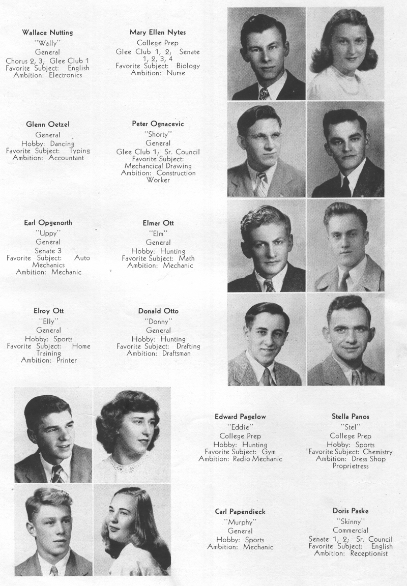 1947 Sheboygan Central High School, Pages 43: Wallace Nutting, Mary Nytes, Glenn Oetzel, Peter Ognacevic, Earl Opgenorth, Elmer Ott, Elroy Ott, Donald Otto, Edward Pagelow, Stella Panos, Carl Papendieck, Doris Paske.