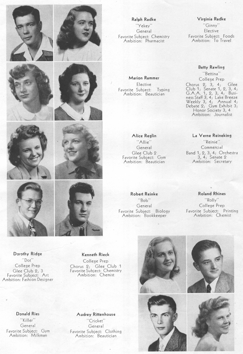1947 Sheboygan Central High School, Pages 45: Ralph Radke, Virginia Radke, Marion Rammer, Betty Rawling, Alice Reglin, La Verne Reineking, Robert Reinke, Roland Rhines, Dorothy Ridge, Kenneth Rieck, Donald Ries, Audrey Rittenhouse.