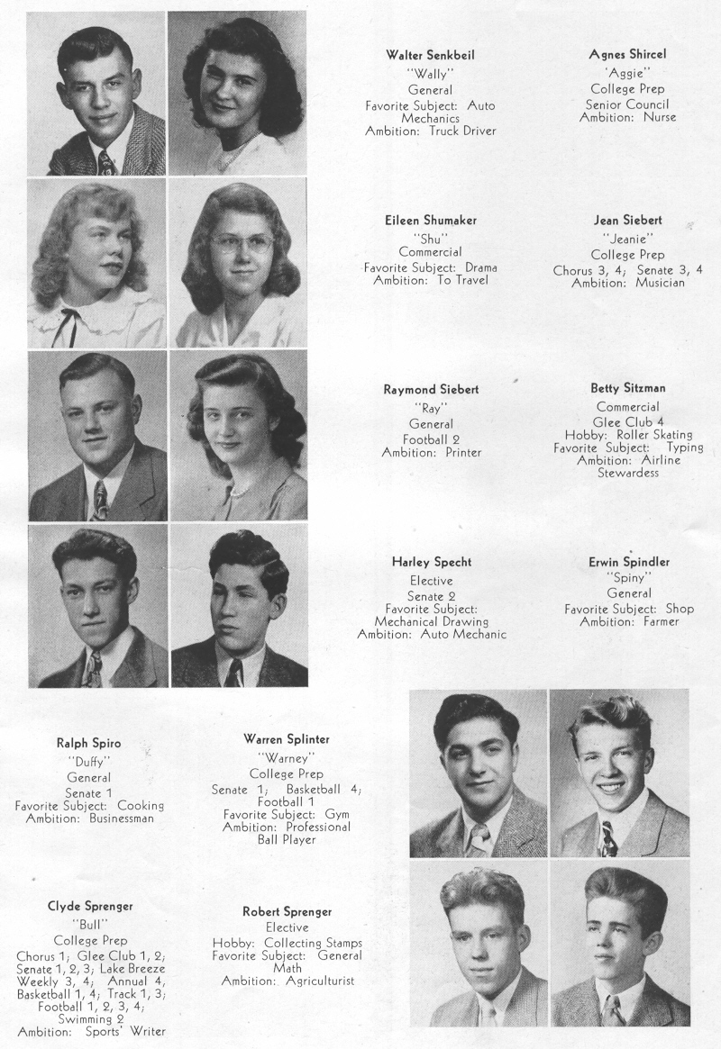 1947 Sheboygan Central High School, Pages 49: Walter Senkbeil, Agnes Shircel, Eileen Shumaker, Jean Siebert, Raymond Siebert, Betty Sitzman, Harley Specht, Erwin Spindler, Ralph Spiro, Warren Splinter, Clyde Sprenger, Robert Sprenger.