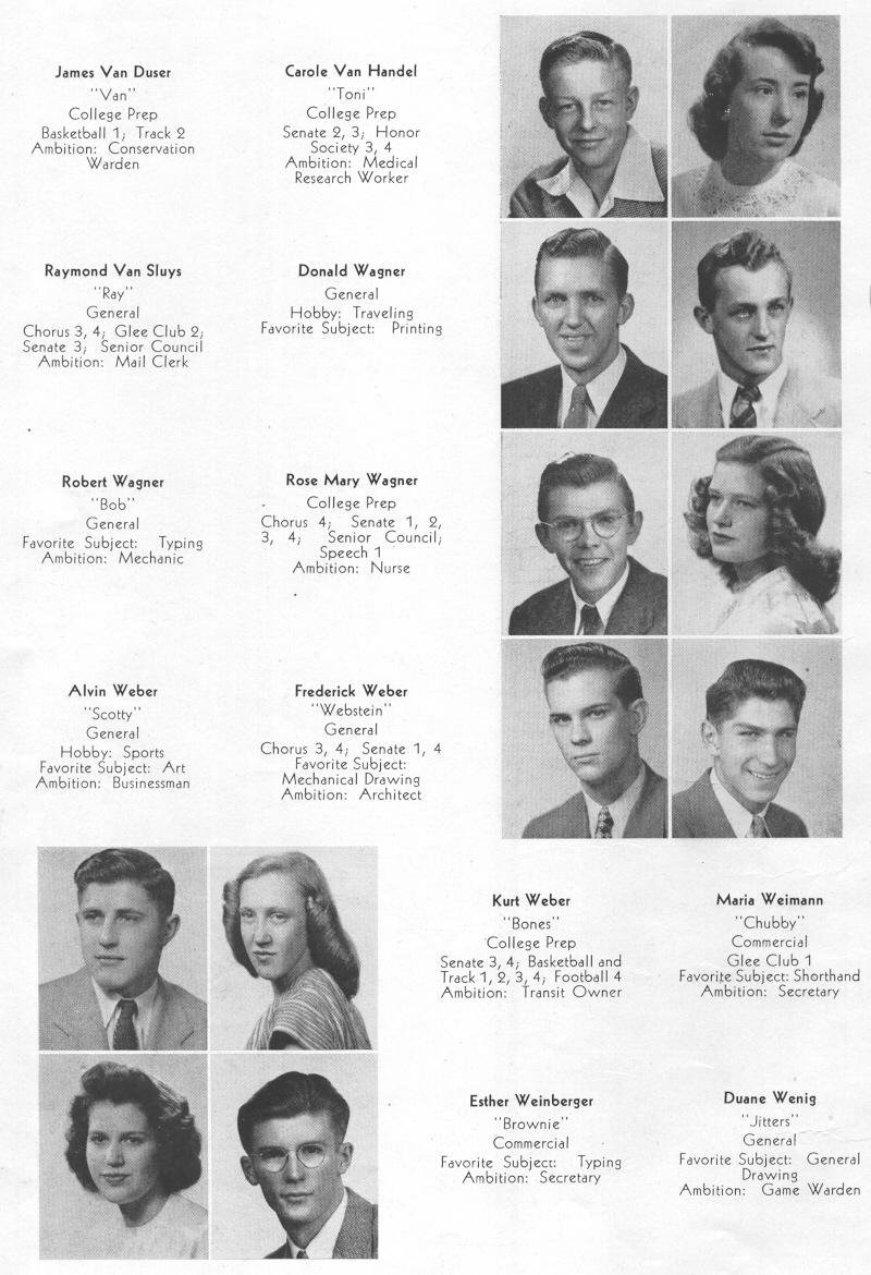1947 Sheboygan Central High School, Pages 52: James Van Duser, Carole Van Handel, Raymond Van Sluys, Donald Wagner, Robert Wagner, Rose Wagner, Alvin Weber, Frederick Weber, Kurt Weber, Maria Weimann, Esther Weinberger, Duane Wenig.
