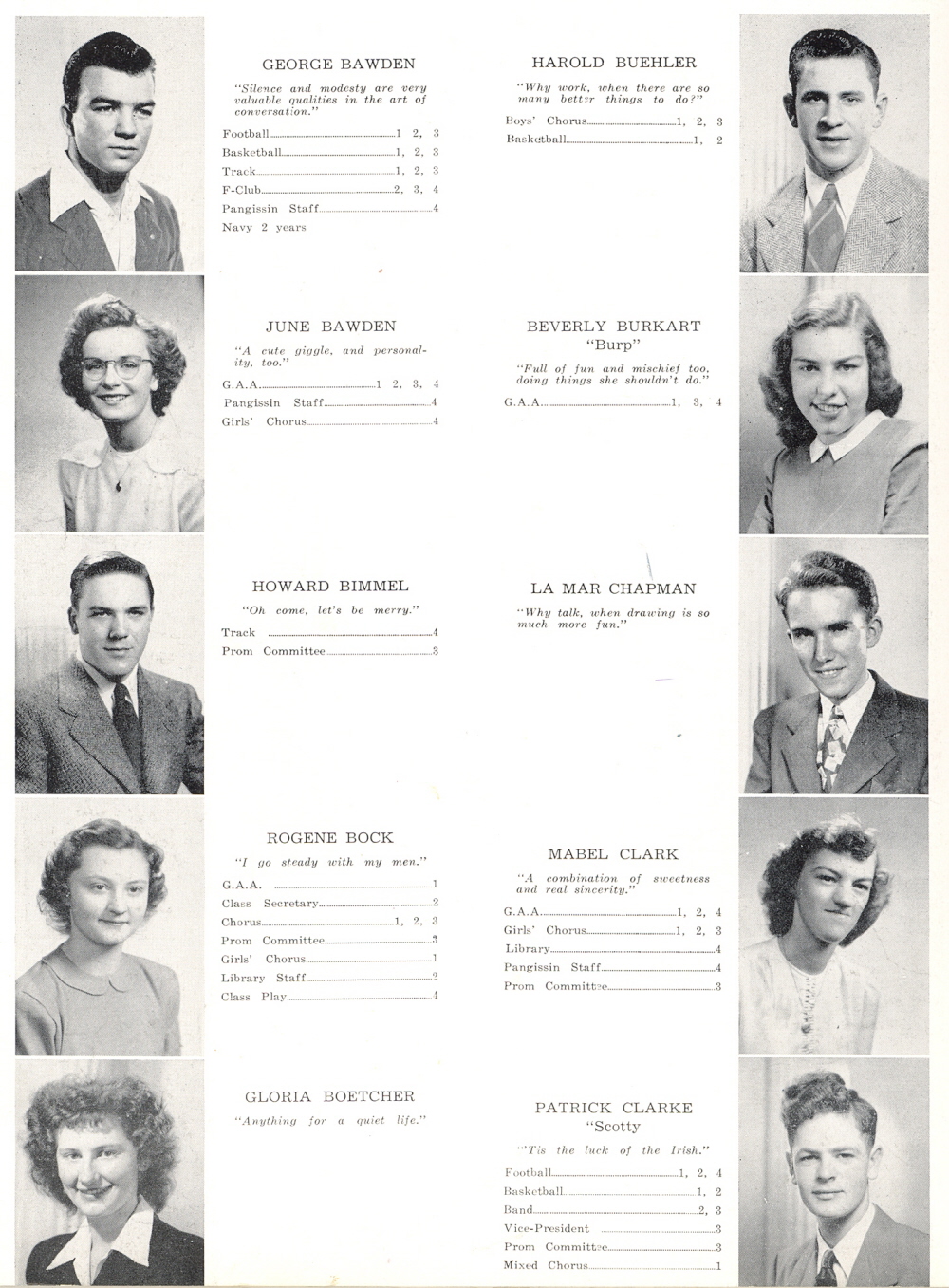1947 Sheboygan Falls High School, Pages 16: George Bawden, June Bawden, Howard Bimmel, Rogene Bock, Gloria Boetcher, Harold Buehler, Beverly Burkart, La Mar Champan, Mabel Clark, Patrick Clarke.