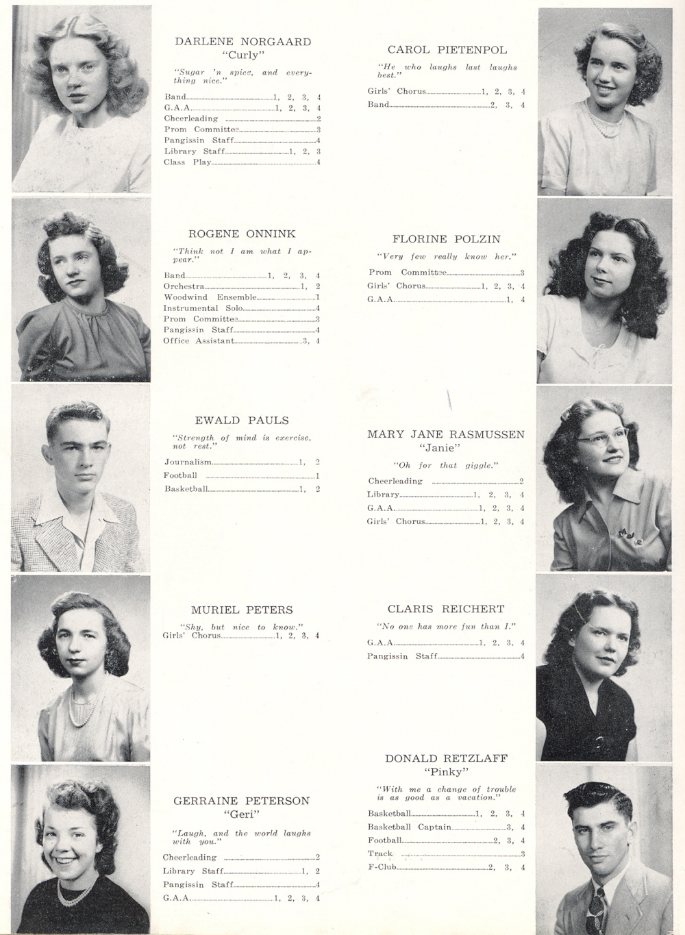 1947 Sheboygan Falls High School, Pages 20: Darlene Norgaard, Rogene Onnink, Ewald Pauls, Muriel Peters, Gerraine Peterson, Carol Pietenpol, Florine Polzin, Mary Rasmussen, Claris Reichert, Donald Retzlaff.