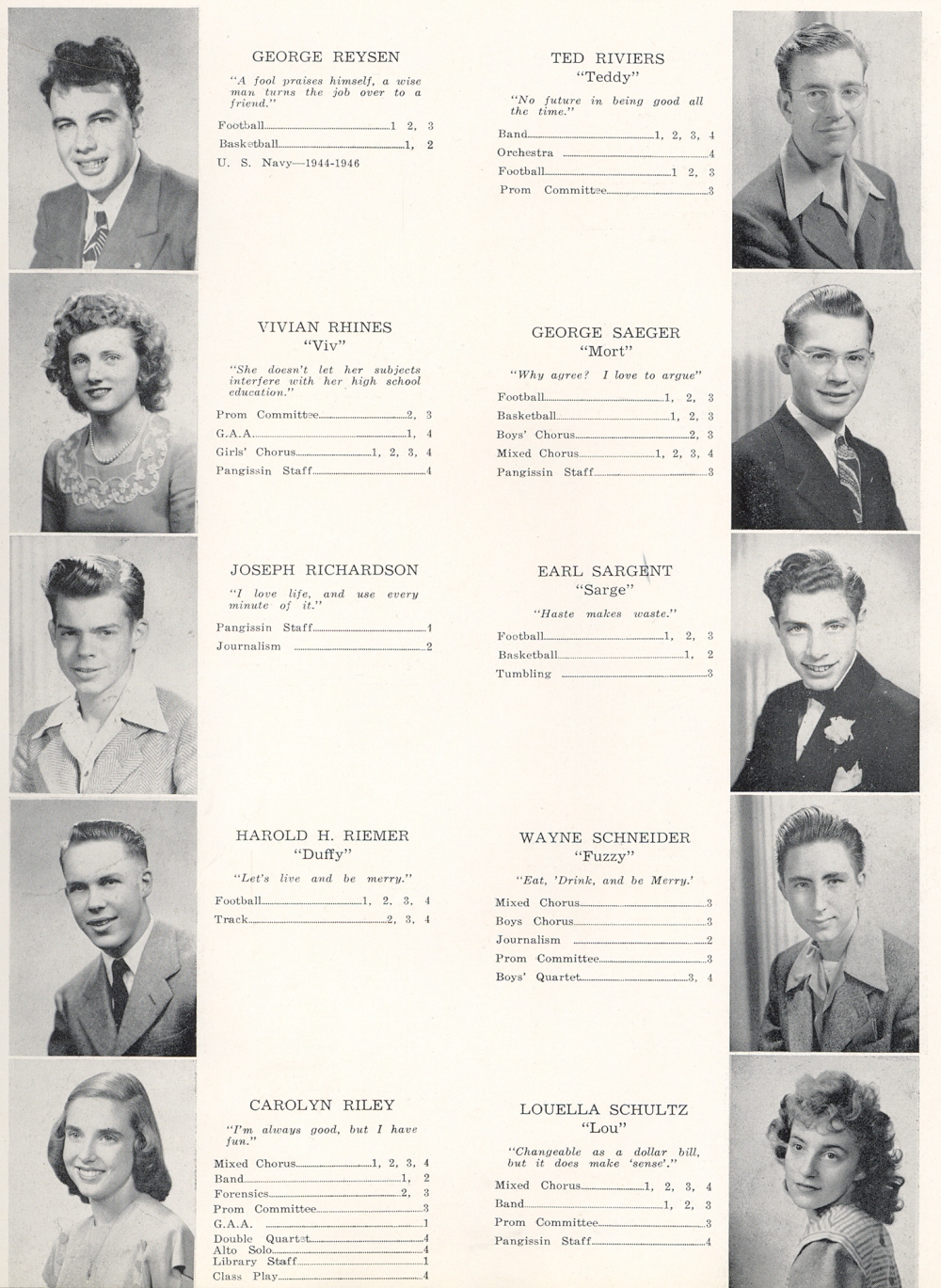 1947 Sheboygan Falls High School, Pages 21: George Reysen, Vivian Rhines, Joseph Richardson, Harold Riemer, Carolyn Riley, Ted Riviers, George Saeger, Earl Sargent, Wayne Schneider, Louella Schultz.