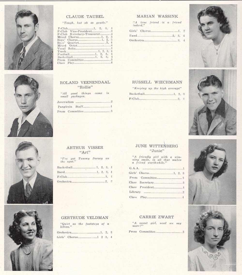 1947 Sheboygan Falls High School, Pages 22: Claude Taubel, Roland Veenendaal, Arthur Visser, Gertrude Veldman, Marian Wassink, Russell Wiechmann, June Wittenberg, Carrie Zwart.