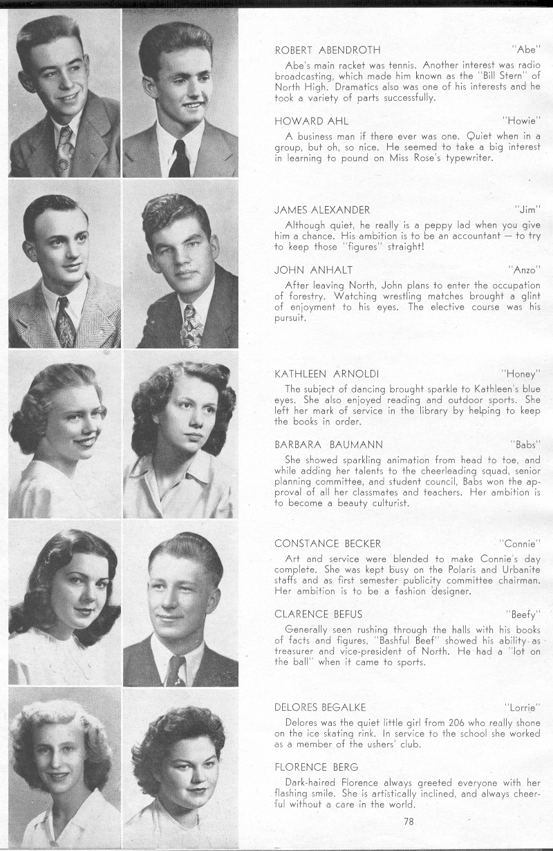 1947 Sheboygan North High School, Pages 78: Robert Abendroth, Howard Ahl, James Alexander, John Anhalt, Kathleen Arnoldi, Barbara Baumann, Constance Becker, Clarence Befus, Delores Begalke, Florence Berg.