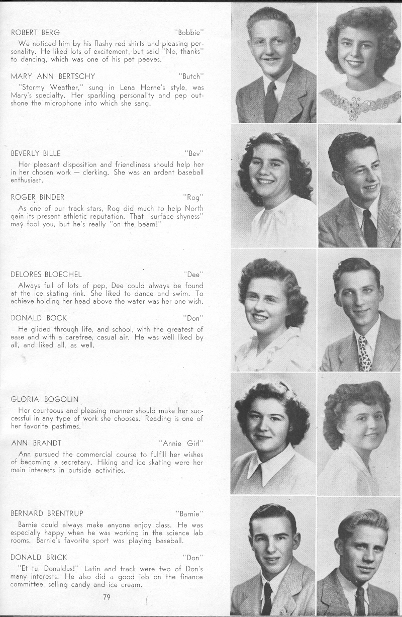 1947 Sheboygan North High School, Pages 79: Robert Berg, Mary Ann Bertschy, Beverly Bille, Roger Binder, Delores Bloechel, Donald Bock, Gloria Bogolin, Ann Brandt, Bernard Brentrup, Donald Brick.