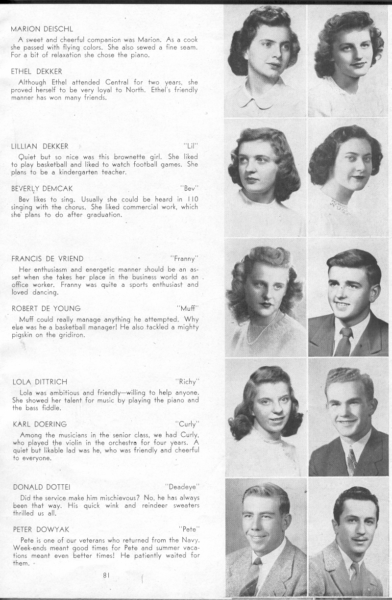 1947 Sheboygan North High School, Pages 81: Marion Deischl, Ethel Dekker, Lillian Dekker, Beverly Demcak, Francis De Vriend, Robert De Young, Lola Dittrich, Karl Doering, Donald Dottei, Peter Dowyak.