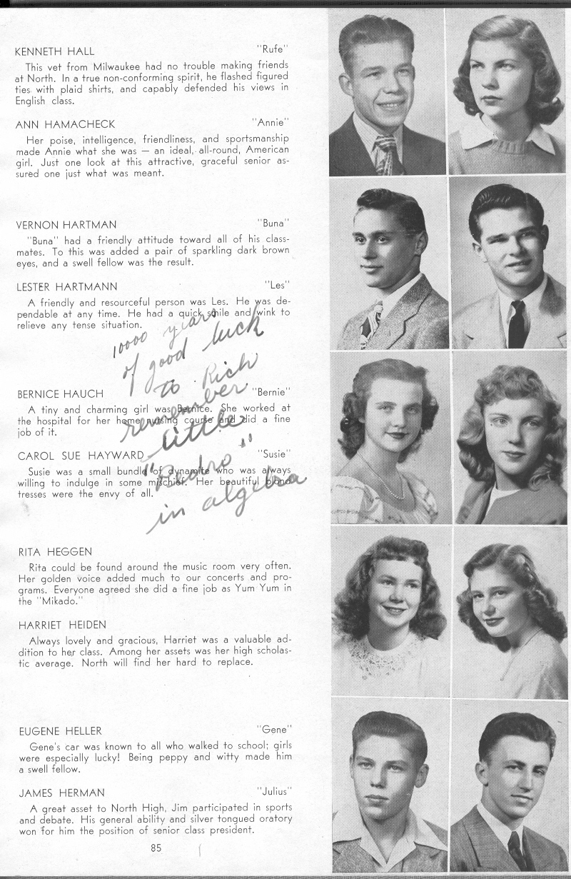 1947 Sheboygan North High School, Pages 85: Kenneth Hall, Ann Hamacheck, Vernon Hartman, Lester Hartmann, Bernice Hauch, Carol Sue Hayward, Rita Heggen, Harriet Heiden, Eugene Heller, James Herman.
