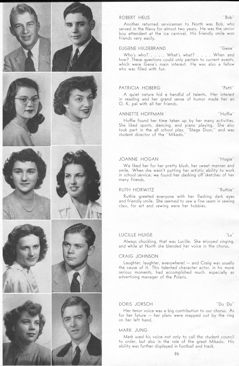 1947 Sheboygan North High School, Pages 86: Robert Heus, Eugene Hildebrand, Patricia Hoberg, Annette Hoffman, Joanne Hogan, Ruth Horwitz, Lucille Huige, Craig Johnson, Doris Jorsch, Mark Jung.