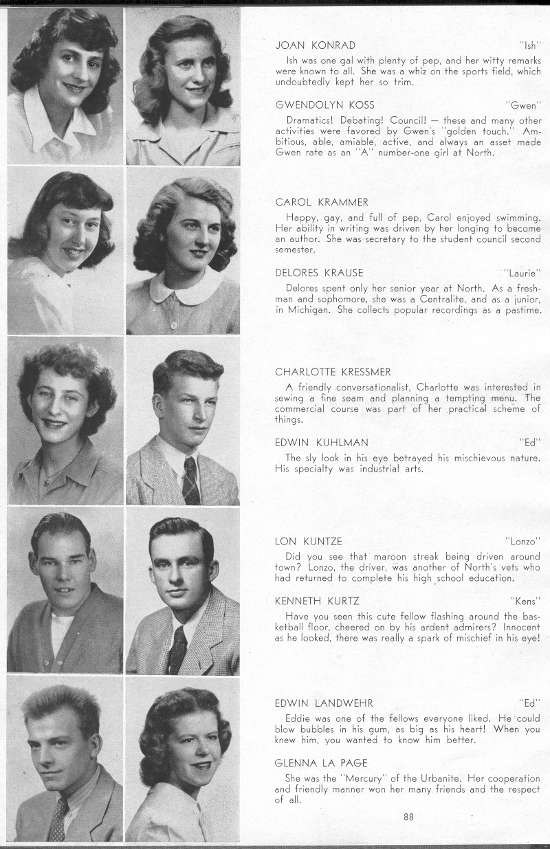 1947 Sheboygan North High School, Pages 88: Joan Konrad, Gwendolyn Koss, Carol Krammer, Delores Krause, Charlotte Kressmer, Edwin Kuhlman, Lon Kuntze, Kenneth Kurtz, Edwin Landwehr, Glenna La Page.