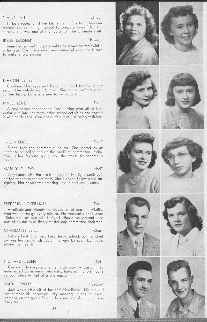 1947 Sheboygan North High School, Pages 89: Elaine Lau, Irene Leissner, Marion Lensen, Mabel Lenz, Frieda Lersch, Marilyne Levy, Frederic Lickerman, Charlotte Leibl, Richard Liezen, Jack Lorenz.