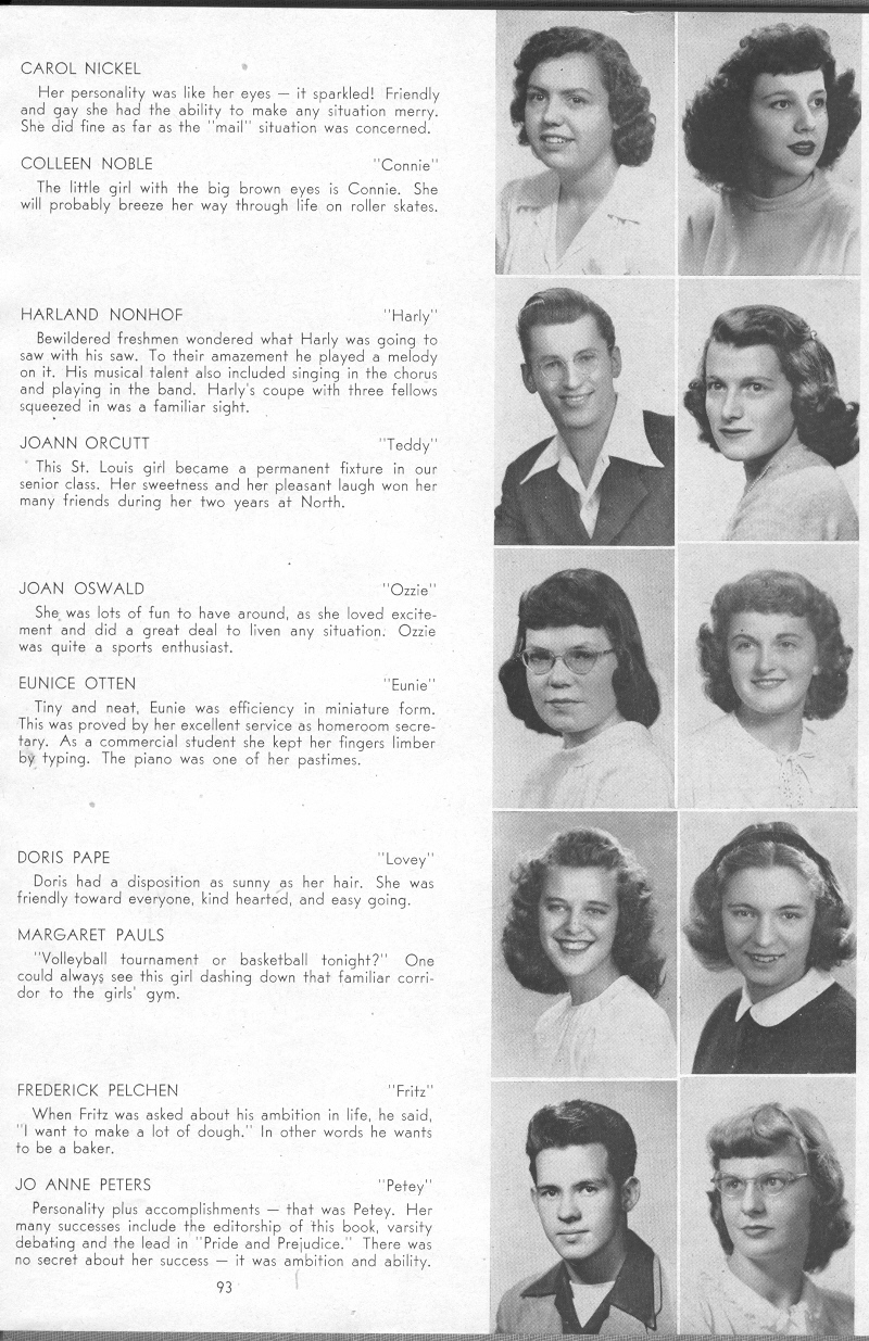 1947 Sheboygan North High School, Pages 93: Carol Nickel, Colleen Noble, Harland Nonhof, Joann Orcutt, Joan Oswald, Eunice Otten, Doris Pape, Margaret Pauls, Frederick Pelchen, Jo Anne Peters.
