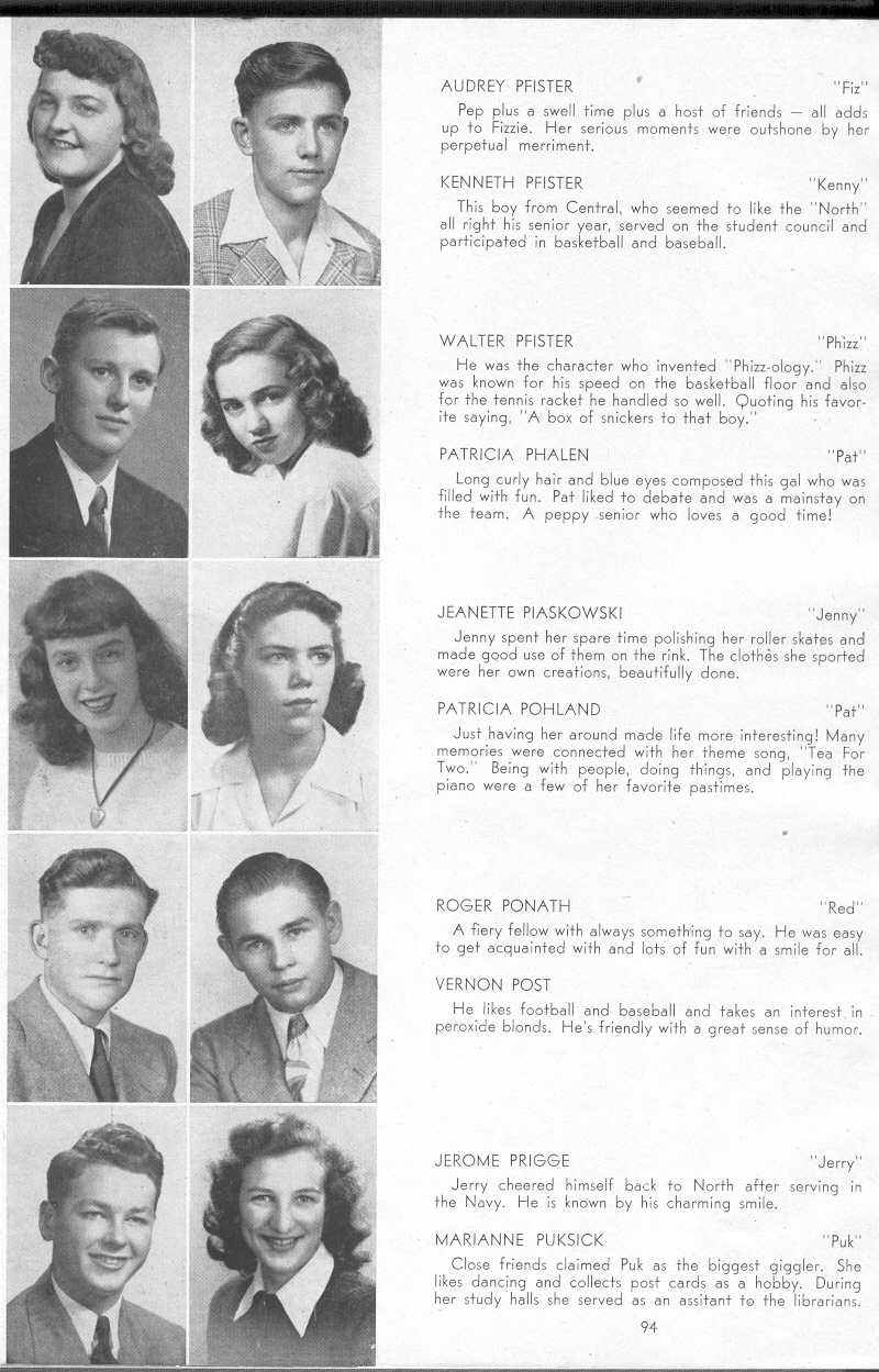 1947 Sheboygan North High School, Pages 94: Audrey Pfister, Kenneth Pfister, Walter Pfister, Patricia Phalen, Jeanette Piaskowski, Patricia Pohland, Roger Ponath, Vernon Post, Jerome Prigge, Marianne Puksick.