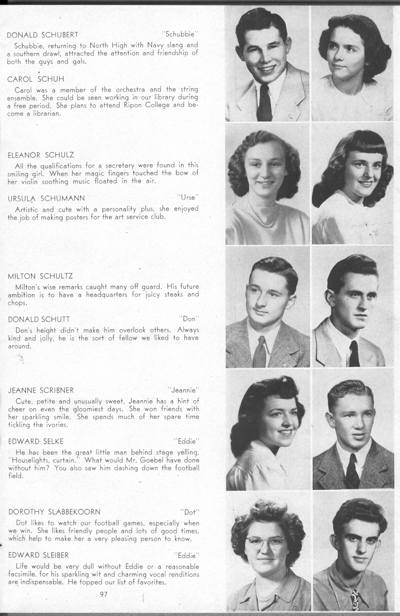 1947 Sheboygan North High School, Pages 97: Donald Schubert, Carol Schuh, Eleanor Schulz, Ursula Schumann, Milton Schultz, Donald Schutt, Jeanne Scribner, Edward Selke, Dorothy Slabbekoorn, Edward Sleiber.