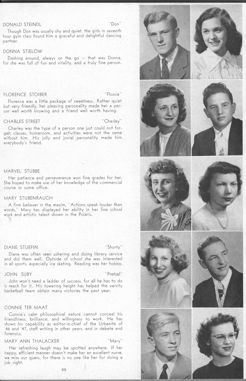 1947 Sheboygan North High School, Pages 99: Donald Steindl, Donna Stielow, Florence Stoiber, Charles Street, Marvel Stubbe, Mary Stubenrauch, Diane Stuefin, John Suby, Connie Ter Maat, Mary Ann Thalacker.