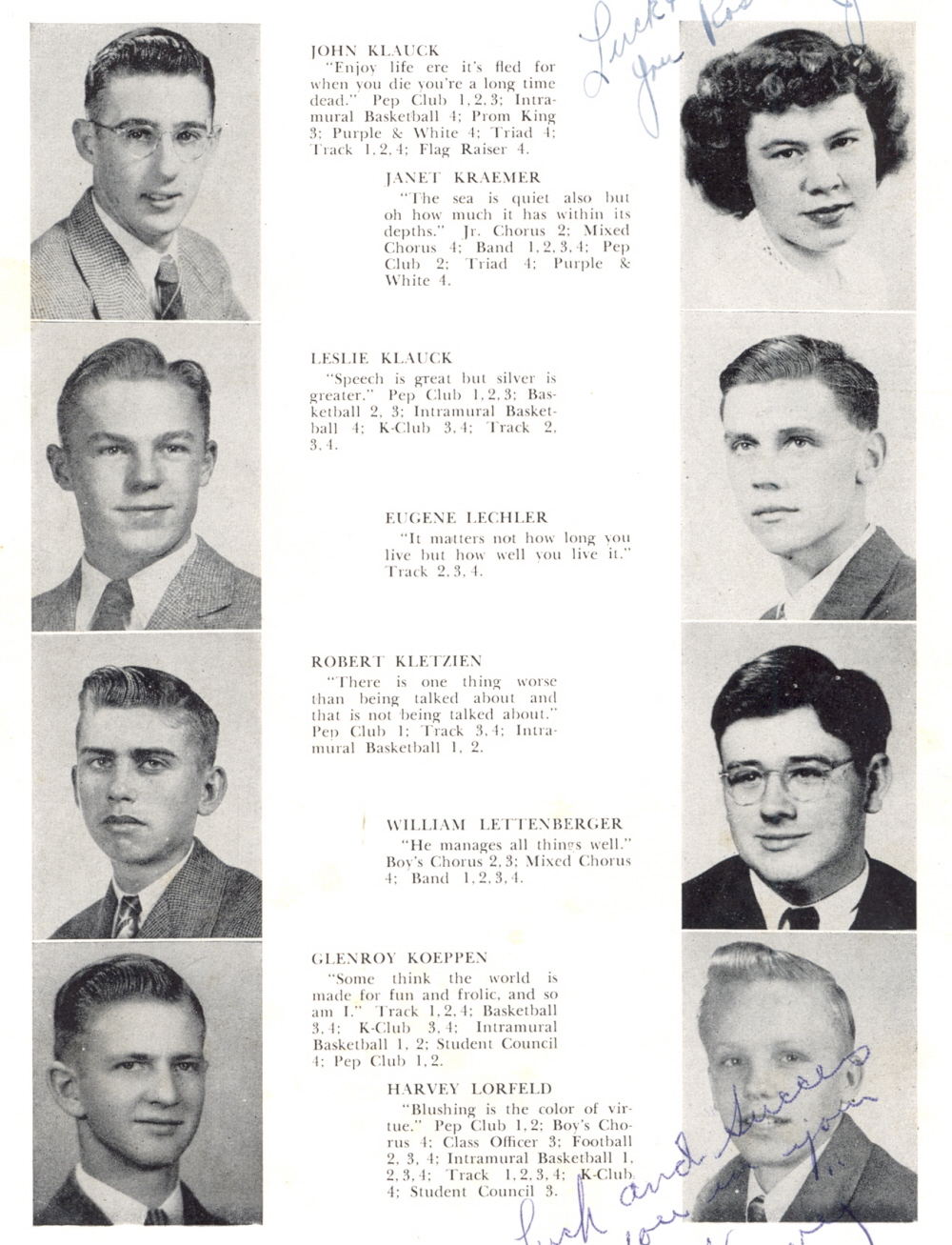1948 Kiel High School, Page 14: John Klauck, Leslie Klauck, Robert Kletzien, Glenroy Koeppen, Janet Kraemer, Eugene Lechler, William Lettenberger, Harvey Lorfeld.