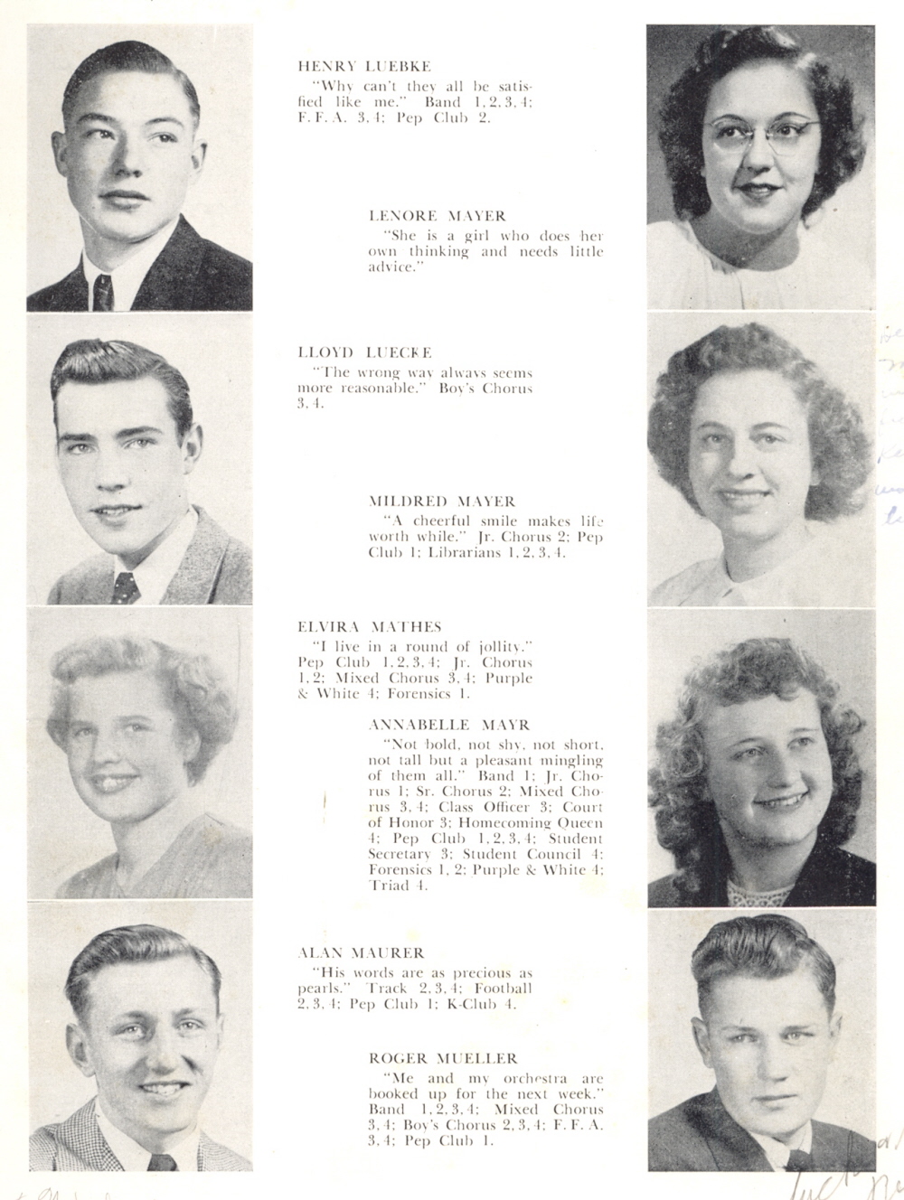 1948 Kiel High School, Page 15: Henry Luebke, Lloyd Luecke, Elvira Mathes, Alan Maurer, Lenore Mayer, Mildred Mayer, Annabelle Mayr, Roger Mueller.