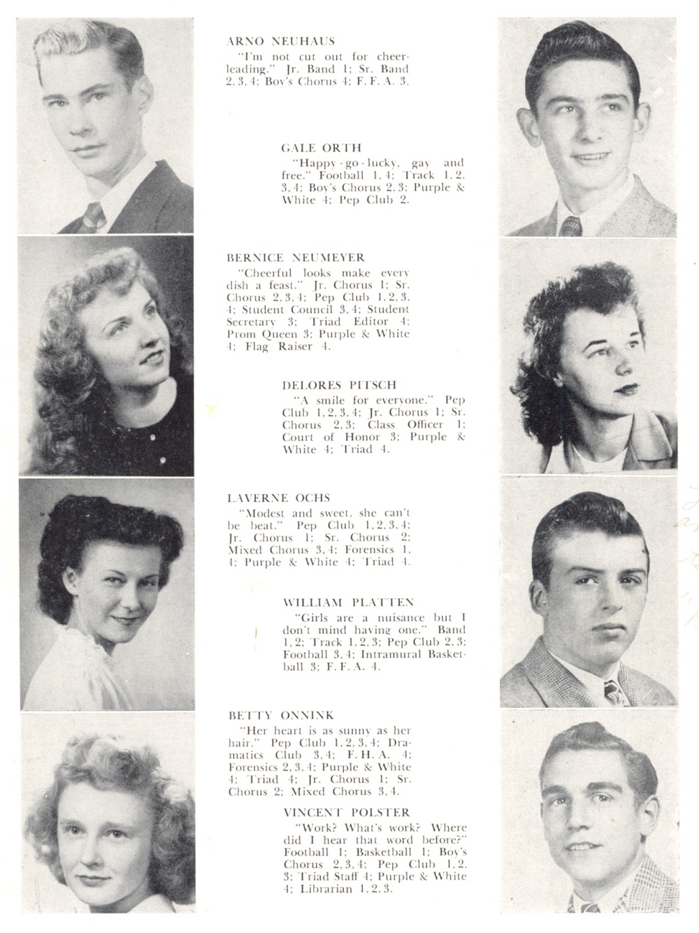 1948 Kiel High School, Page 16: Arno Neuhaus, Bernice Neumeyer, Laverne Ochs, Betty Onnink, Gale Orth, Delores Pitsch, William Platten, Vincent Polster.